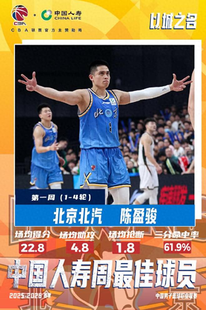 CBA官方宣布陈盈骏首周当选周最佳球员。 CBA官方宣布,陈盈骏当选2025-2026年CBA联赛常规赛首周周最佳球员。过去四场比赛,陈盈骏场均出场25.5分钟,得到22.8分2.5篮板4.8助攻1.8抢断。他的投篮命中率高达63.5%,三分球命中率高达61.9%,场均出手3.3个三分球。陈盈骏比赛一开始的状态确实很糟糕,投篮命中率比内线球员还要高。球队越强,陈盈骏表现越好,对阵新疆得到29分,对阵辽宁得到26分。陈盈骏现在是北京男篮的头号得分手,甚至比外援还要出色。北京男篮四场比赛全部获胜。这是陈英俊职业生涯第四次获得最佳奖本周的。此前3次都是在广州男篮,他首次随北京男篮获得周最佳。今年季后赛,陈盈骏场均贡献16.6分3.2篮板4.6助攻。他的关键球能力太强了,经常用三分球拯救北京男篮。要知道,陈英俊已经32岁了,而且还在进步!陈英俊对自己的要求非常高,不仅是在训练上,在饮食、作息上也是如此。国内玩家确实应该好好学习一下。陈盈骏将会成为男篮的一个难题。中国男篮与中华台北男篮同组。他们将于明年三月见面。如何防守陈盈骏将成为男篮后卫线的难题。目前国内后卫还没有能够达到陈盈骏的水平,包括赵睿。此外,中国台北队还有一位非常优秀的后卫,就是效力于天津男篮的林廷谦。林庭谦目前场均贡献22.5分4篮板6.8助攻,进攻能力也非常强。