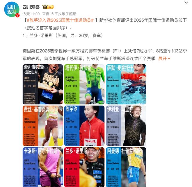 体育界即将过去2025年,各大体育媒体平台都在总结回顾,也评选出运动员们的表现。上周,新华社评选出2025年国内十佳运动员,孙颖莎、石宇奇、陈钰曦、苏一鸣、邹静源、胡凯、秦海洋、巩立姣、刘焕华、江玉燕。从场地划分来看,每项运动项目最多只能选派一名人。这也是王楚钦成绩优异但也未能入围的主要原因。几天后,新华社评选出2025年国际十佳运动员,具体如下:1.兰多·诺里斯(英国,赛车)2.卡洛斯·阿尔卡拉斯(西班牙,网球)3.伊利亚·马里宁(美国,花样滑冰)4.陈钰曦(中国,跳水)5.阿曼德·杜普兰蒂斯,肯雅普(花样滑冰)5.阿曼德·杜普兰蒂斯和斯菲尔德。田径) ) 7. Summer McIntosh(加拿大,游泳) 8. Tadej Pogača(斯洛文尼亚,自行车) 9. Shay Gilgeous-Alexander(加拿大,篮球)10.奥斯曼·登贝莱(法国,足球) 在这份名单中,只有一名中国球员入围,那就是跳水领域的陈雨曦。孙颖莎、王楚钦、谭海洋、苏一鸣等均落榜。此外,运动场涵盖赛跑、网球、花样滑冰、跳水、田径、游泳、自行车、篮球、足球等9个项目。仅田径项目最多有 2 名决赛入围者。对于陈钰曦的提名,新华社在评论中写道:“世锦赛夺得女子单人10米台、双人10米台、混合团体三枚金牌,还荣获国际泳联年度女子跳水运动员奖。”他选择的重要性在于将女子10米台上的第一位置与蒙多以统治性的表现结合起来,成为中国跳水队的新一代领军人物。不过,热爱乒乓球的球迷认为,孙颖莎也是有资格入围的,因为孙颖莎英莎今年的成绩和意义并不亚于陈钰曦,包括6个单打冠军、3个双打冠军、2个团体冠军、连续四届女乒女单世界第一、双料世乒赛冠军。世锦赛上唯一的单打对外胜率达到100%、首个WTT大满贯单打四冠王等成就。此外,孙颖莎在体育界的影响力也高于陈钰曦。这位国乒主力刚刚被评选为年度最受欢迎社交媒体运动员和《体坛周刊》年度最佳女运动员。另外,某博客发起了年度实力人物投票活动。孙颖莎最新票数已经突破4000万,锁定体坛第一名毫无悬念。当然,乒乓球领域没有任何运动员入围前十,这也与现实有关。事实上,每个平台都有自己的选择标准。例如,国内某扑克平台评选出2025年国内外十佳运动员,乒乓球领域最多的选手有三名,分别是范振东、陈梦、王曼昱。还有斯诺克、棒球等场。其中,范振东和陈梦的选择显然备受争议。今年取得的成绩自然不如王楚钦和孙颖莎。而德约科维奇则不同,今年在四大满贯赛上的成绩显然不如辛纳或阿尔卡拉兹,但他们可以击败辛纳或阿尔卡拉兹,入围前十名运动员。